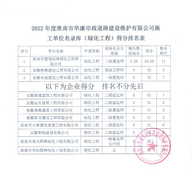 根據(jù)《2022年度淮南市華康市政道路建設(shè)維護(hù)有限公司工程建設(shè)項目施工勞務(wù)單位名錄庫征集公告》相關(guān)規(guī)定,目前已按公告規(guī)定的評審方法完成評審工作?,F(xiàn)將評審結(jié)果公示如下:見附表
